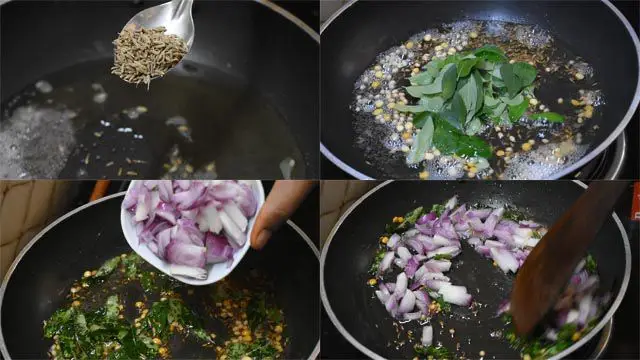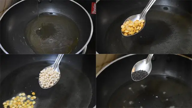 1. In a pan heat oil and fry chana dal, mustard seeds, cumin seeds, moong dal and curry leaves.