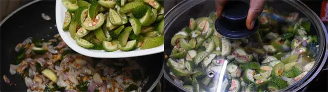 3.  Put slit Spiny Gourd and mix well. Close the lid and cook for 10 minutes.
