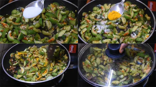 5. As our recipe is akakarakaya fry, we need to evaporate moisture and make it dry, we need to fry for a minute or two without a lid.