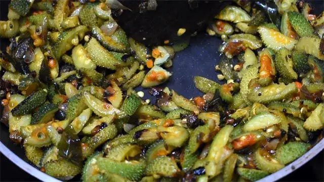 The Akakarakaya Fry Recipe is done when the gourds are golden brown and crunchy. They must be firm on the outside and tender inside. You can just pierce a piece with a fork to see if they are done.
