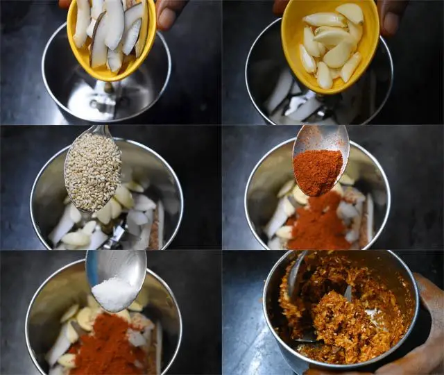 6. In a mixer grinder put coconut pieces, sesame seeds, red chilli powder and garlic cloves. Grind for a while and make a coarse paste.