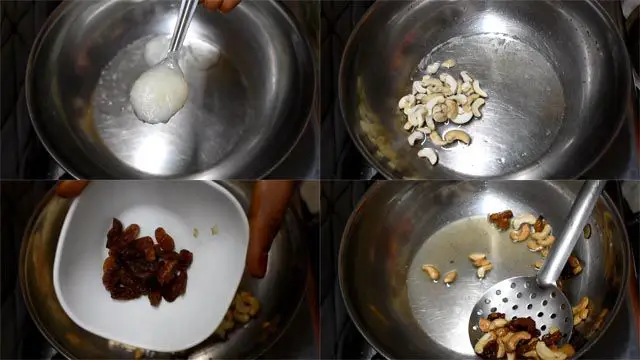 1. Heat ghee in a pan, add cashew and raisins. Roast till cashew turns golden brown and raisins swell.