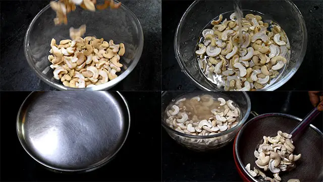 1. Put cashews in a bowl and pour the required water to soak them for 30 minutes. Drain water and put cashews in a skillet.