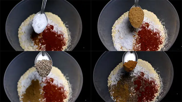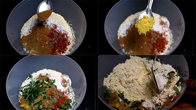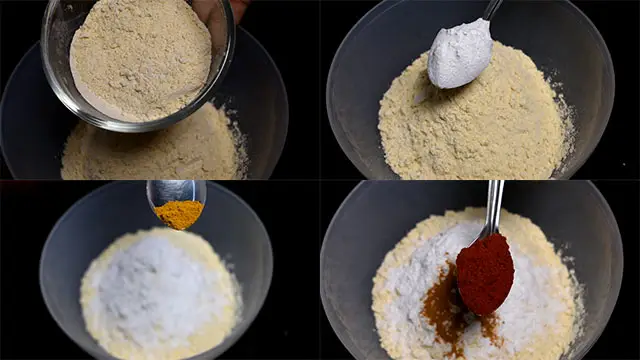 - In a mixing bowl combine rice flour, red chili powder, turmeric powder, and besan flour.