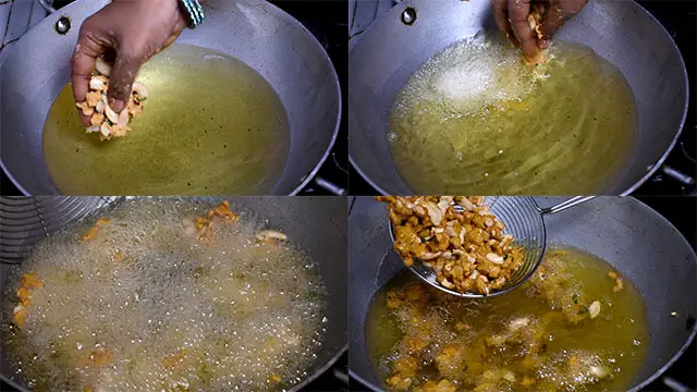 6. Heat oil in a pan and put cashew batter in small batches. Deep fry on a low flame till they turn golden colour.
