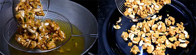 7. Drain excess oil and transfer the cashew pakoda recipe to a plate.