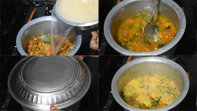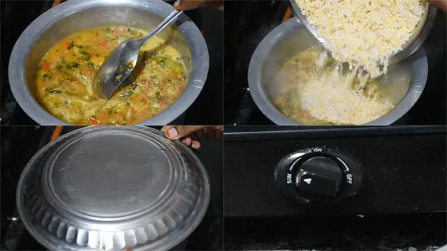 10.  Add rice and dal in boiling water. Mix and cook for 15-20 minutes (till rice is cooked) with lid covered on low flame.