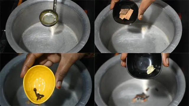 2.  Heat oil in a thick bottom vessel and add cinnamon sticks, cloves and green cardamoms.