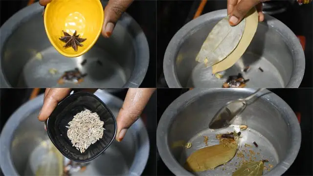 3. Fry green cardamoms, star anise, cinnamon sticks, bay leaf, green cardamom and cumin seeds.