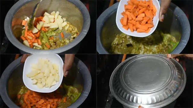 6.  Slice carrots and potatoes into small pieces and add them into this mix and cook for a minute with lid covered.