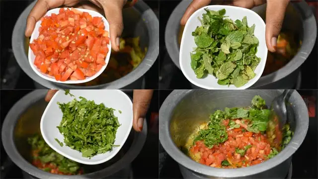 7.  Put finely sliced tomatoes, mint leaves and coriander leaves. Mix.