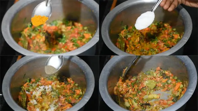 7. Add mint and coriander leaves. Sprinkle salt, turmeric powder, black pepper powder. Mix all ingredients.