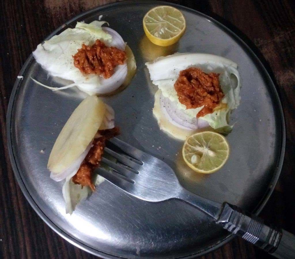 6. Place onions above potatoes and top with grated cabbage pieces.