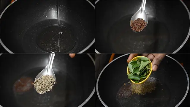 1.  Heat oil in a pan and add mustard seeds, cumin seeds and curry leaves.