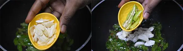 2.  Crush garlic cloves and add them. Add slit green chillies and mix.
