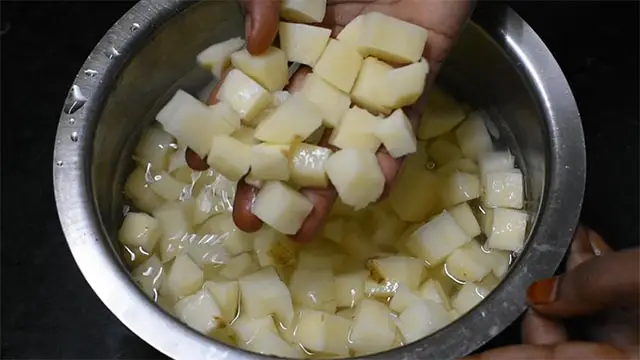 3.  Peel and slice potatoes into small cubes of even size and put them in salt water to remove starch.
