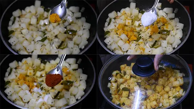 5.  Open the lid and sprinkle turmeric powder, salt, red chilli powder. Mix and cook for 5-10 minutes till they turn soft.