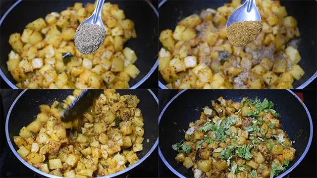 6.  To check the status we can crush one cube, if they slit easily then the potatoes are done. Sprinkle coriander powder, garam masala powder and mix well. Garnish the Potato Fry Andhra Style recipe with coriander leaves and serve hot with chapatti.