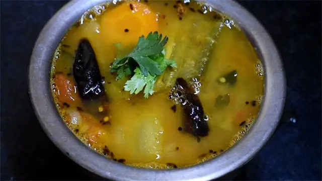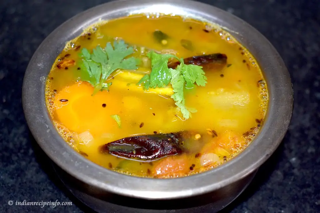Vegetables: The combination of vegetables is the key to the wholesomeness of sambar. Tomatoes provide natural sweetness and a hint of acidity. Drumsticks, bottle gourd, and carrots provide a variety of textures and soak up the flavor of the sambar nicely. Ladies finger (okra) thickens the sambar and provides a special taste.