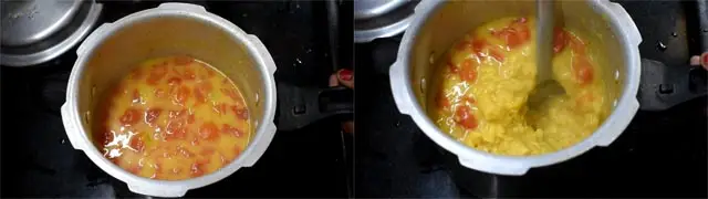 3. Add little oil, turmeric powder and tomatoes to dal and pressure cook for 4 whistle blows.
