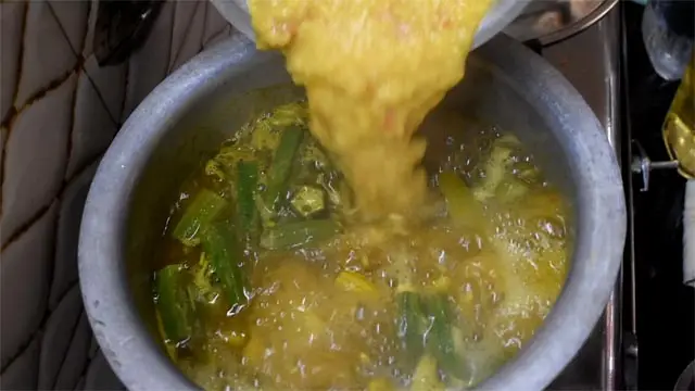 11.  While vegetable and tamarind pulp is being boiled, open the lid and pour dal paste in it.