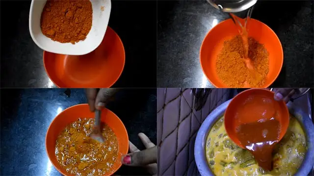 14.  In a small bowl put sambar powder and pour water to make it liquid. Add this liquid to the tamarind pulp and cook on low flame.