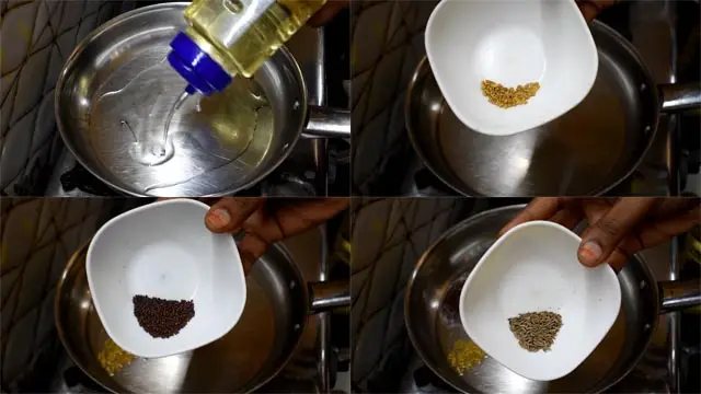 16. For tempering, we can add oil or ghee. Heat oil in a pan and fry mustard seeds, fenugreek seeds and cumin seeds.