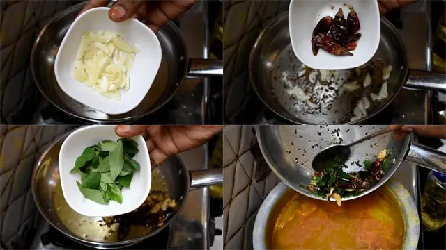 16.  Add garlic cloves, dry red chillies, curry leaves and sauté for a while. Add this temper to sambar Recipe.