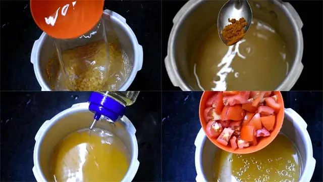 2.  For each bowl of dal add two bowls of water, ¼ tbsp. turmeric powder, 1 tbsp oil and tomatoes.