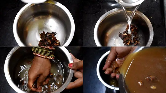 7.  In another vessel add tamarind, ½ liter water and soak for a minute and squeeze tamarind pulp.
