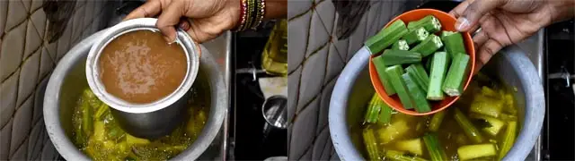 9.  When vegetables are cooked, add tamarind pulp and ladies finger and cook for a minute with lid covered.