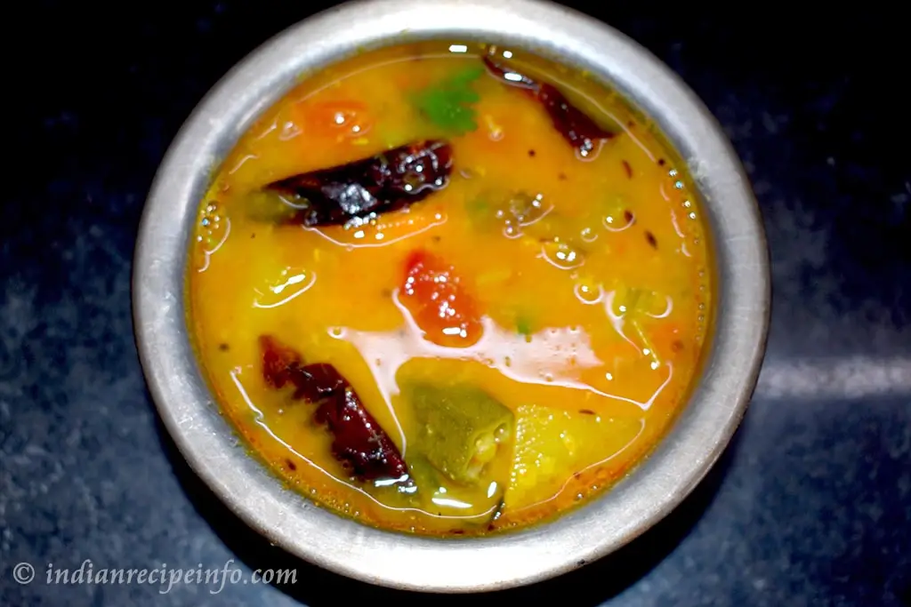 Spices added in making this recipe differ. To get thick consistency we add Sambar Powder.Either we add spice powder or make without it. We sometimes make use of tamarind pulp or tomato to give tangling flavor.